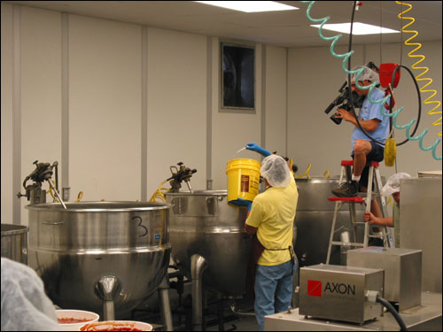 Staff monitors the filling machine as it fills Crazy Charley jars with Sauce